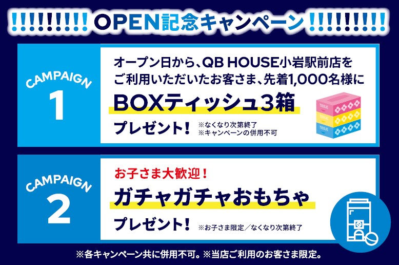【OPENキャンペーン】 ①4月1日(水)から先着1,000名様にBOXティッシュ3箱プレゼント! ②お子様歓迎!先着でガチャガチャおもちゃプレゼント! ※当店をご利用のお客様限定。なくなり次第終了。他キャンペーンとの併用不可。