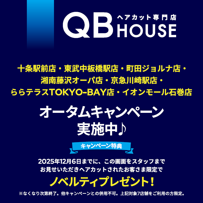 対象店舗:湘南藤沢オーパ店・町田ジョルナ店・東武中板橋駅店・十条駅前店・京急川崎駅店・イオンモール石巻店・ららテラスTOKYO-BAY店 ◆この特設ページを見せて対象店舗のいずれかでヘアカットされたお客さまにノベルティプレゼント! ※2025年12月6日まで。受付時にキャンペーンページをスタイリストまでお見せください。対象店舗ご利用のお客さま限定。他キャンペーンとの併用不可。ノベルティがなくなり次第終了。