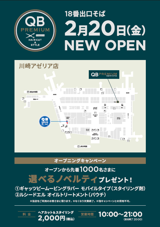 | 備考 | QB PREMIUM 川崎アゼリア店の詳細はこちら 当店(QB PREMIUM)のカット料金は2,000円(税込)となります。 |